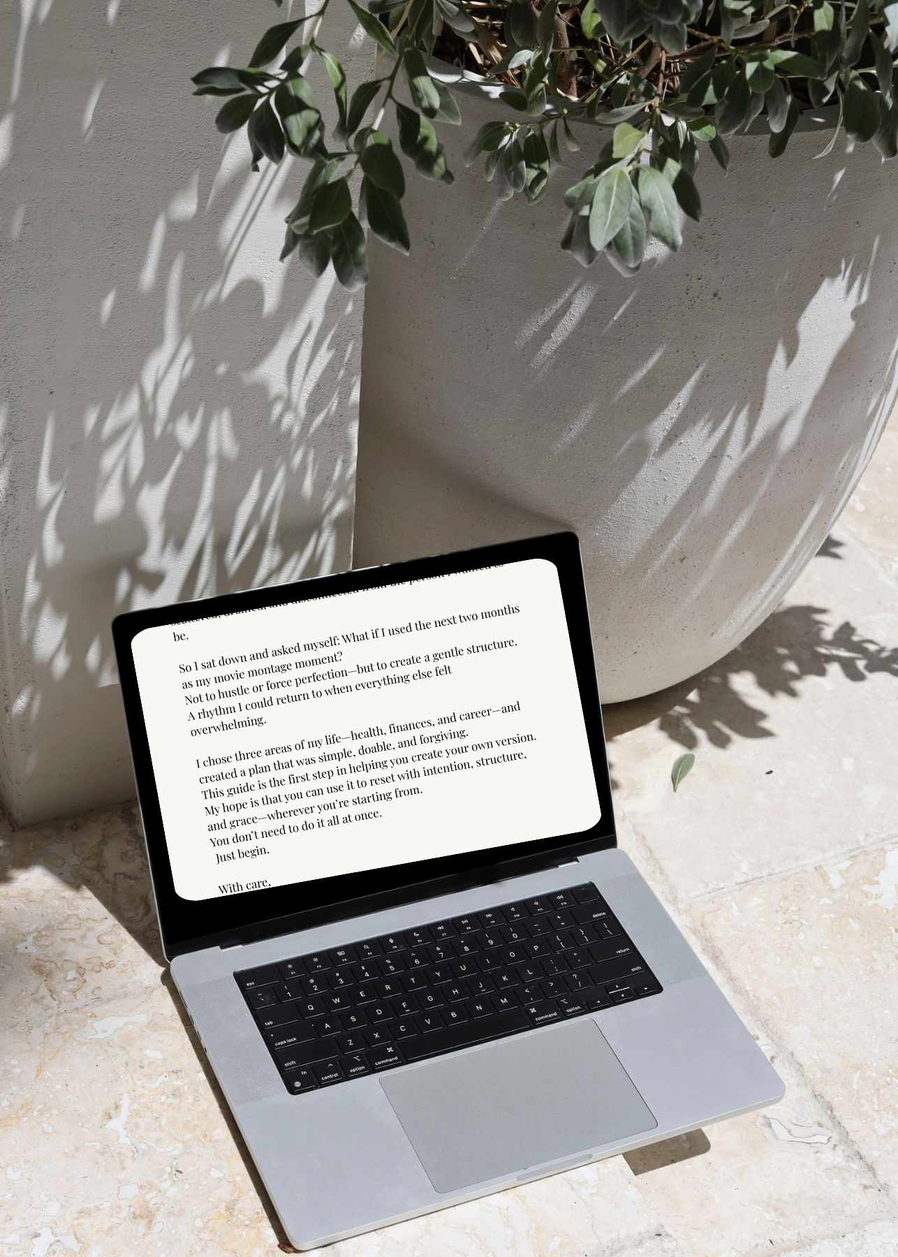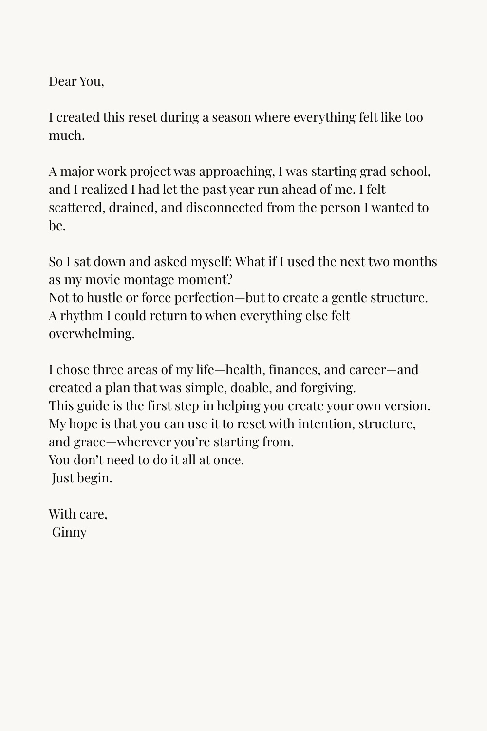 The 2-Month Reset Guide is a simple, supportive companion designed for seasons when life feels scattered or overwhelming. This 5-page guide offers reflection prompts, focus exercises, and soft structure to help you move through the next eight weeks with more clarity, groundedness, and direction.